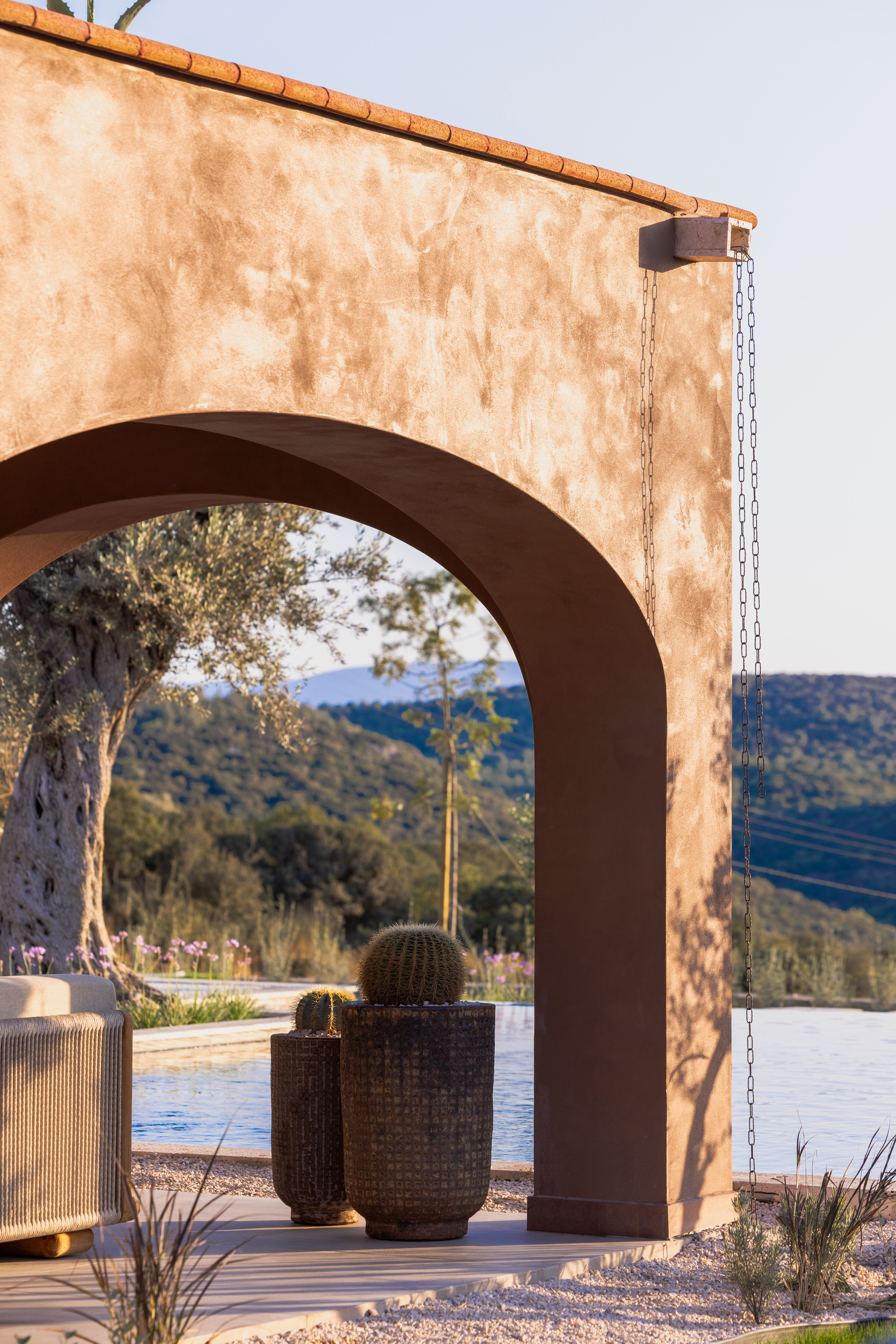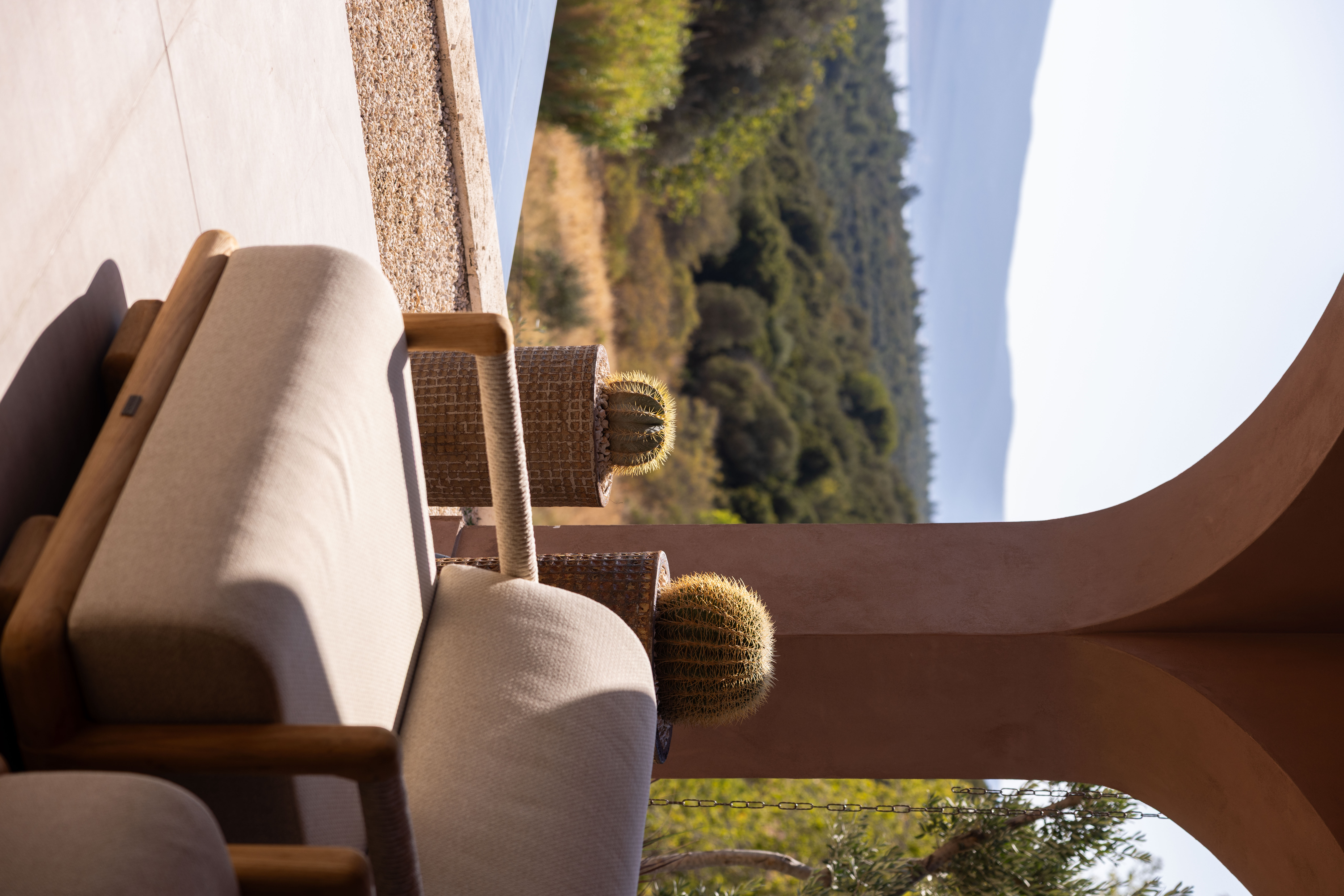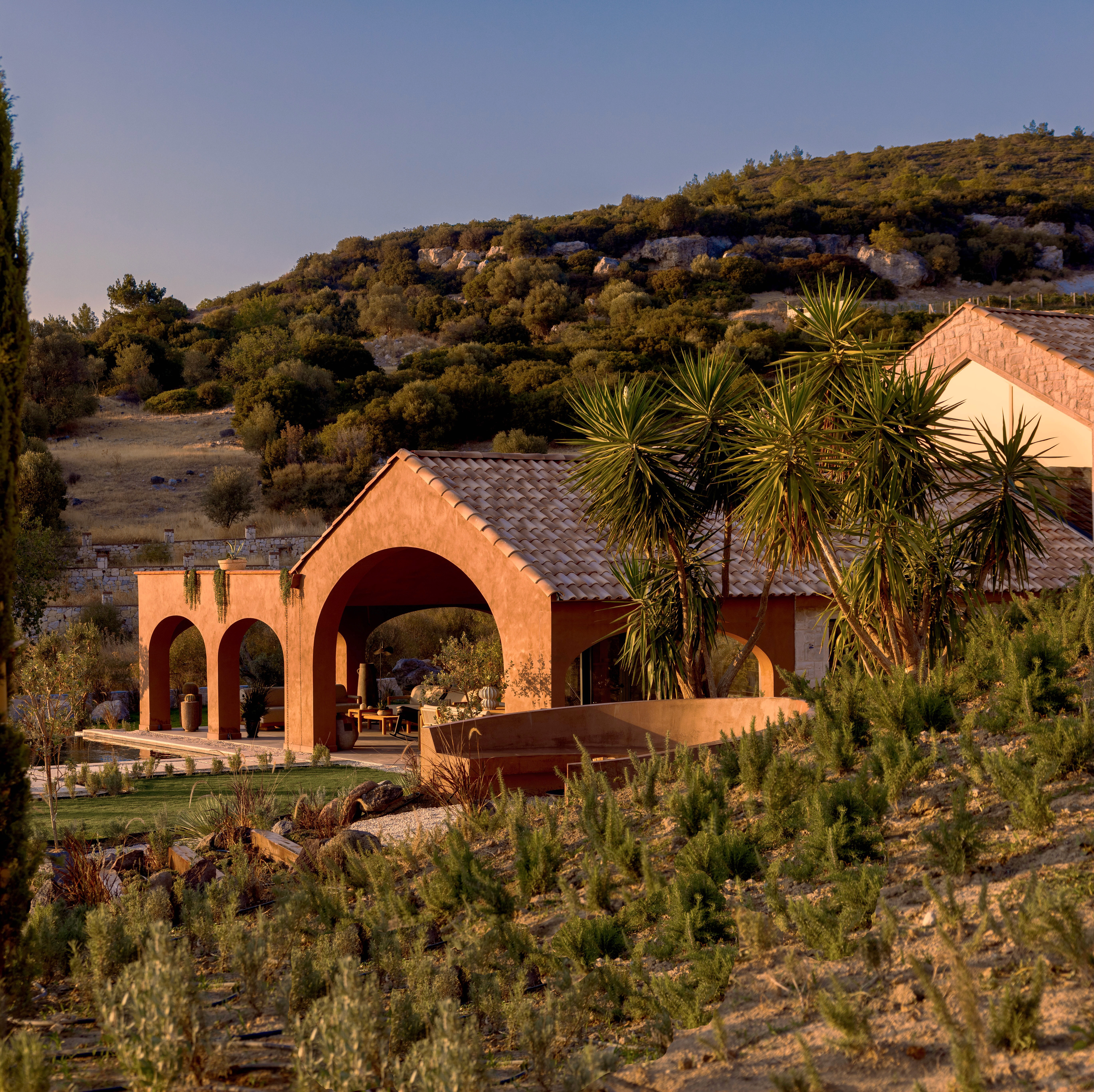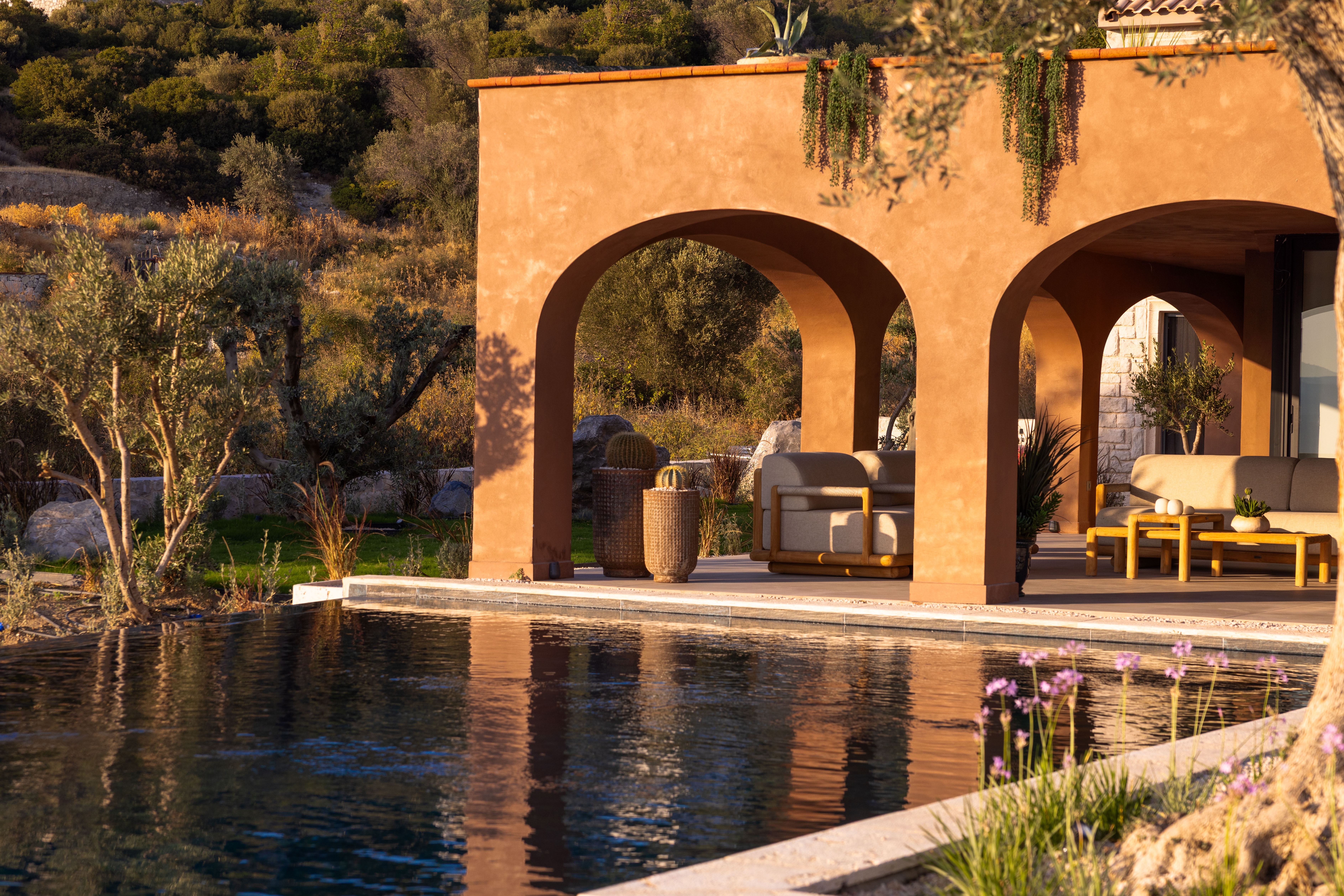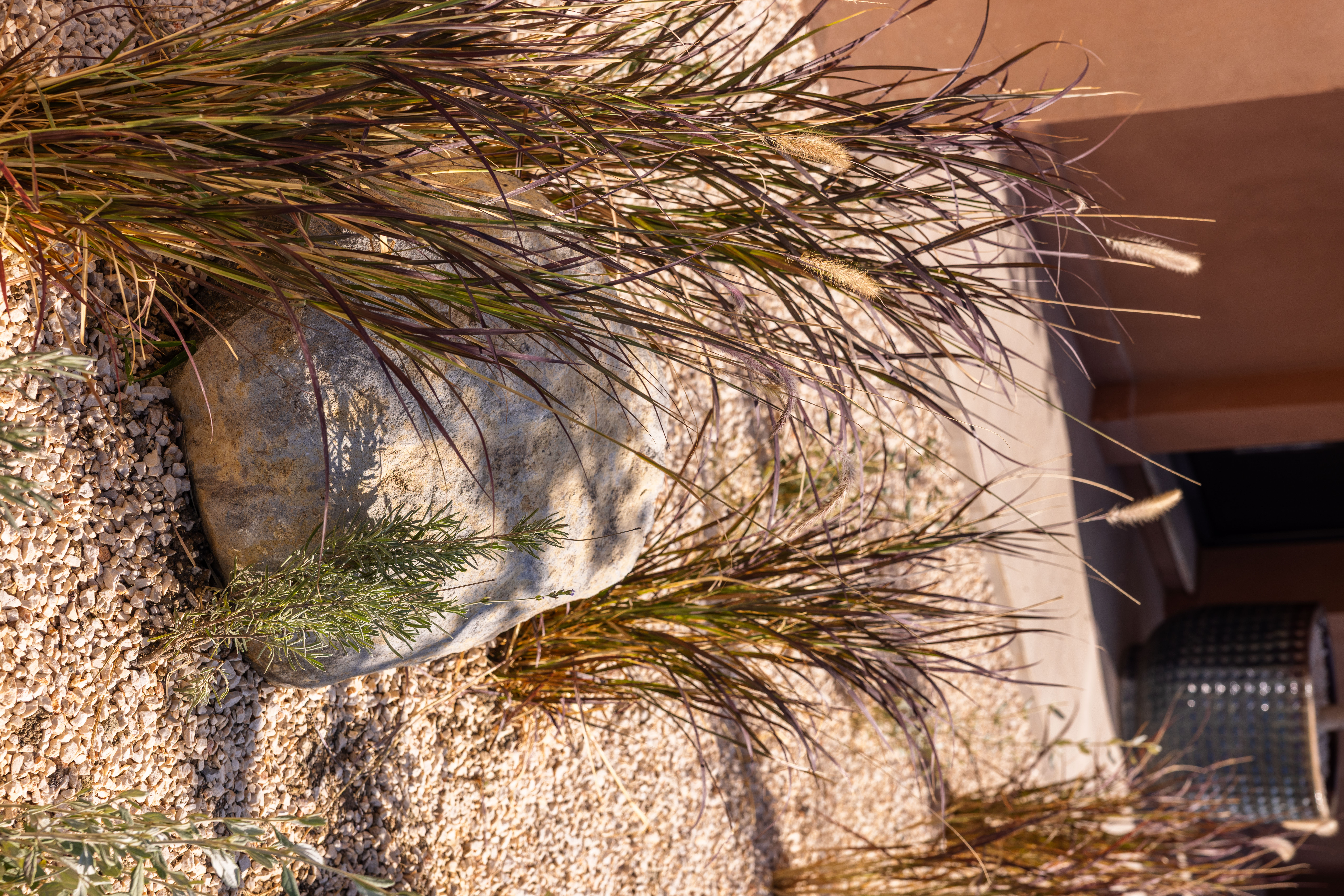 As part of the project, the client requested a low- maintenance landscape design with minimal irrigation, due to the region’s hot and dry summer climate. The planting palette includes drought-tolerant species such as cacti, lavender, rosemary, agave, and native grasses, chosen for their resilience and ability to thrive in the local environment.
